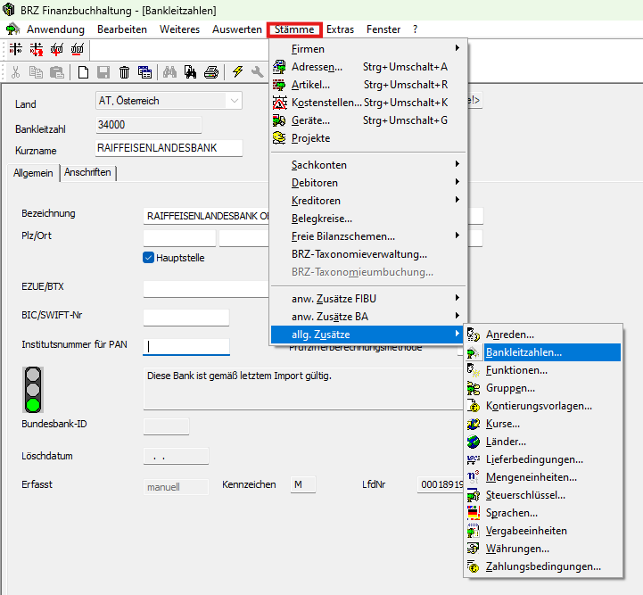 1. Bitte navigieren Sie zunächst über den Reiter „Stämme“ zu „allg. Zusätze“ und anschließend zu „Bankleitzahlen“.