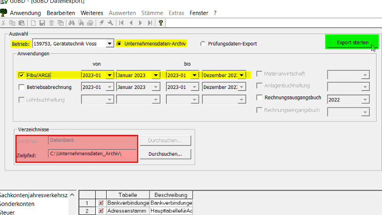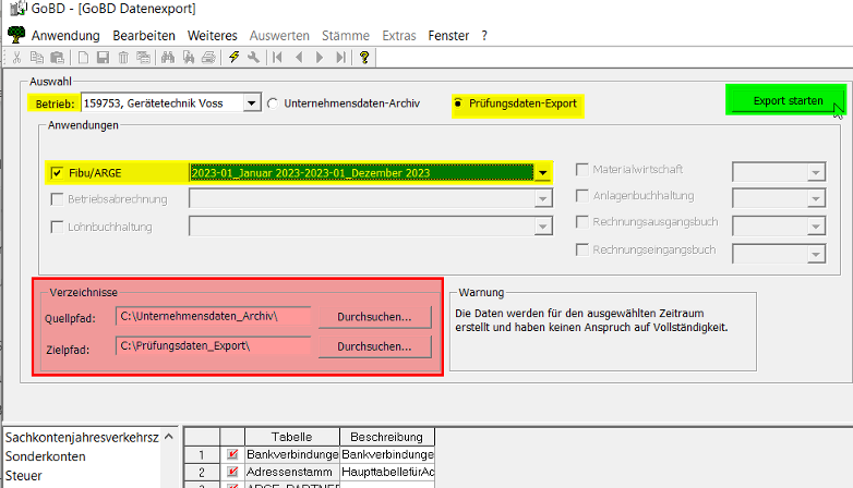 Voraussetzungen zum durchführen eines GoBD Datenexport sind: