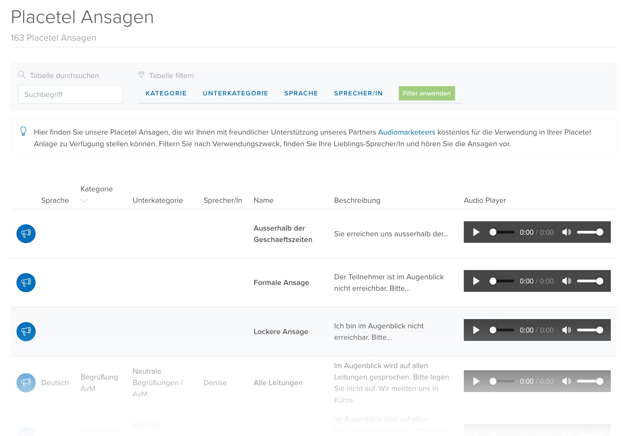 - Ansagen für spezielle Anlässe: Placetel bietet über 150 vorgefertigte Ansagen (z. B. für Feiertage).