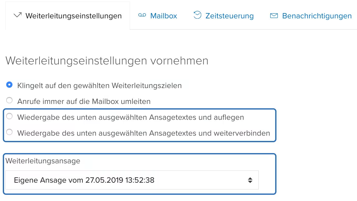 - Ansage abspielen und auflegen: Nur Ansage, kein Gespräch.
