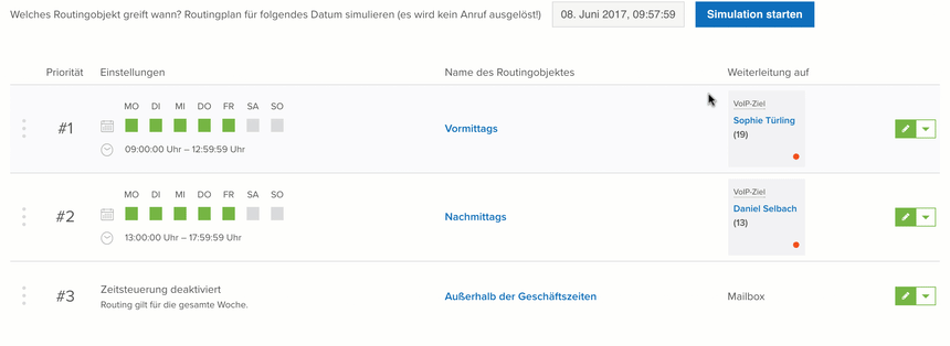 - Nutzen Sie die Simulation mit Wunschdatum und Uhrzeit, um zu prüfen, welches Routingobjekt aktiv wäre.