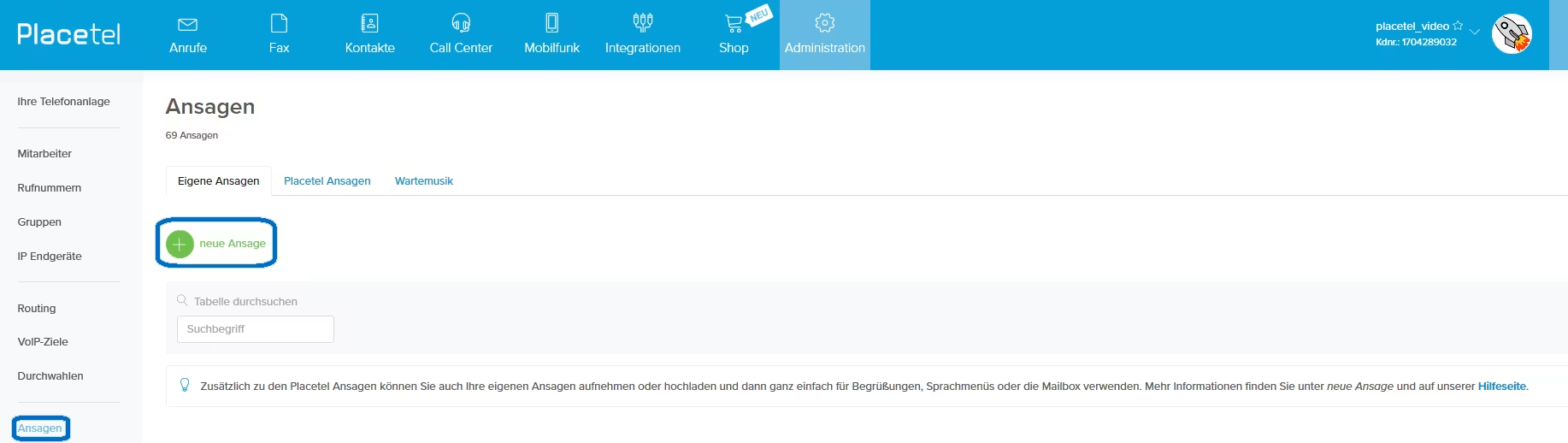 • Neue Ansage anlegen: Name vergeben, optional Beschreibung hinzufügen