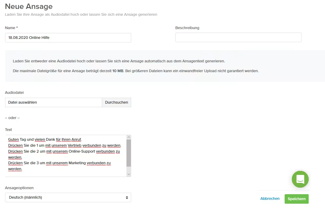 • Ansage entweder als Audiodatei hochladen oder Text eingeben