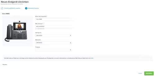 - Wählen Sie Hersteller und Modell, geben Sie die MAC-Adresse ein.