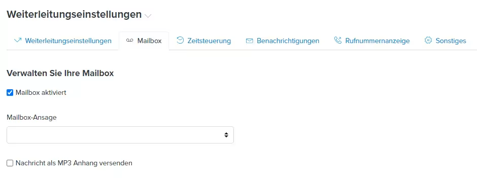 Die Mailbox-Einstellungen gelten sowohl für Rufnummern als auch für Routingobjekte. Weitere Informationen zur Benachrichtigung per E-Mail finden Sie im Artikel „Benachrichtigungen“.