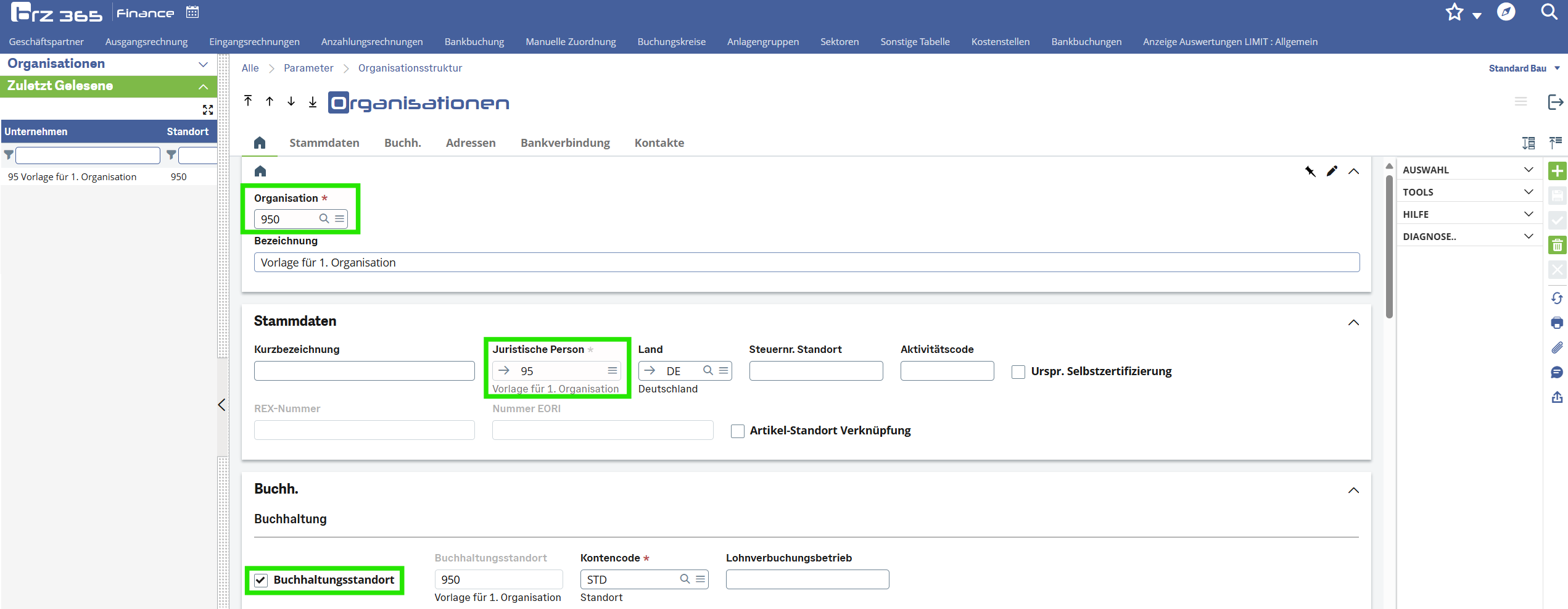 BRZ365 Finance ► Administration ► Unternehmen einrichten ► Organisation