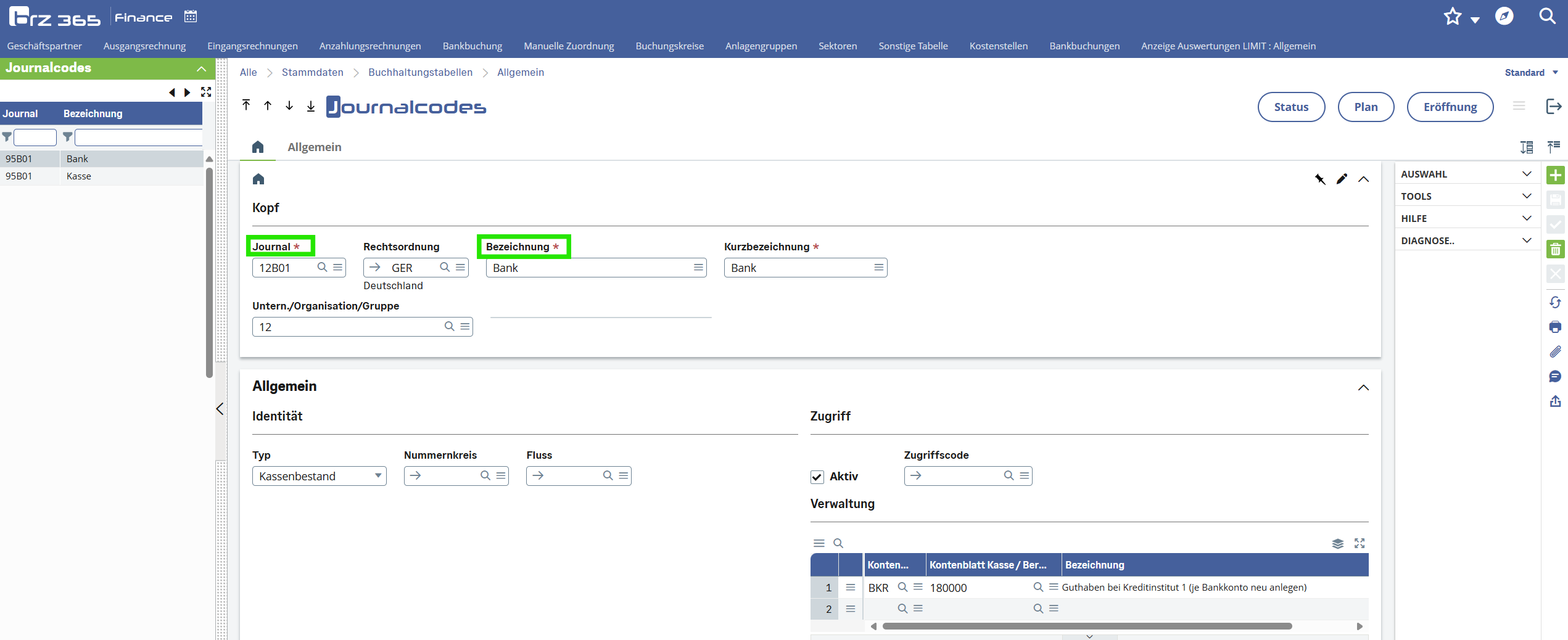 BRZ365 Finance ► Administration ► Unternehmen einrichten ► Journal eröffnen