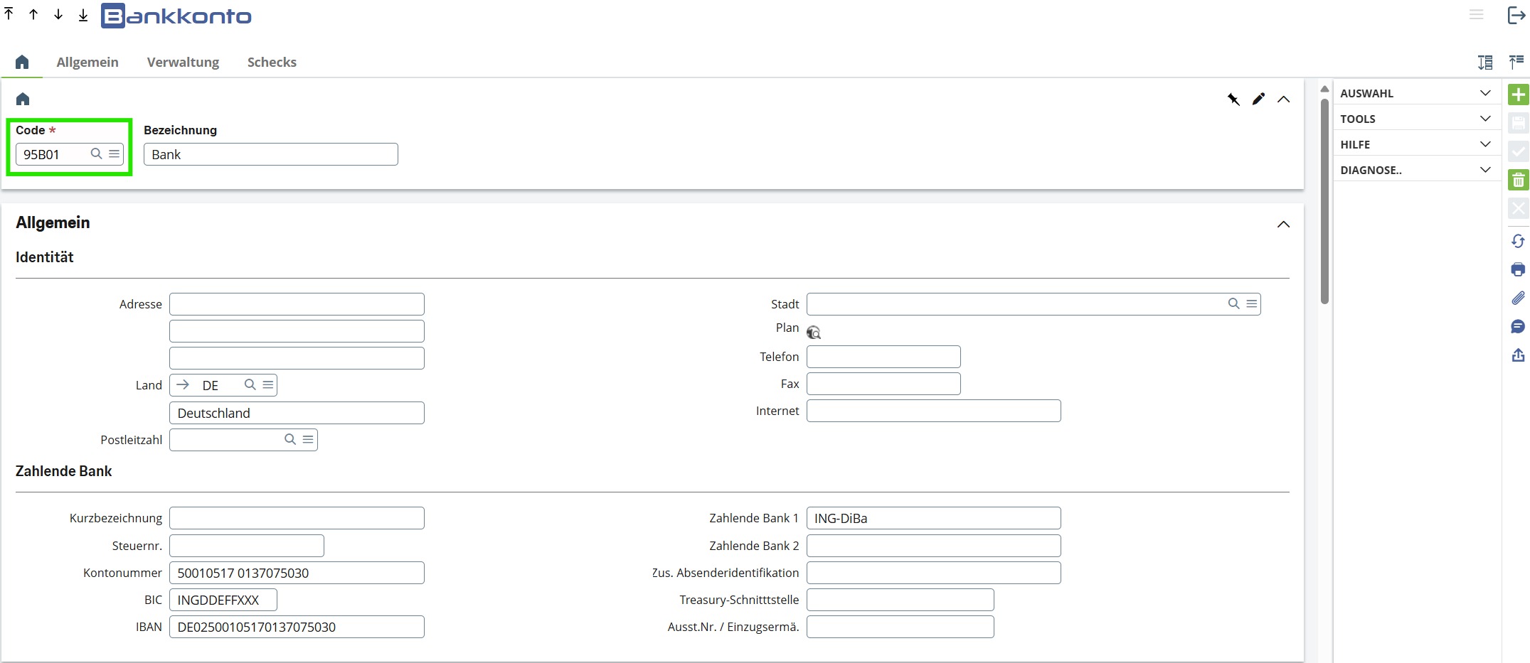 Im Bereich "Allgemein" können Sie die Stammdaten der Bank einpflegen.