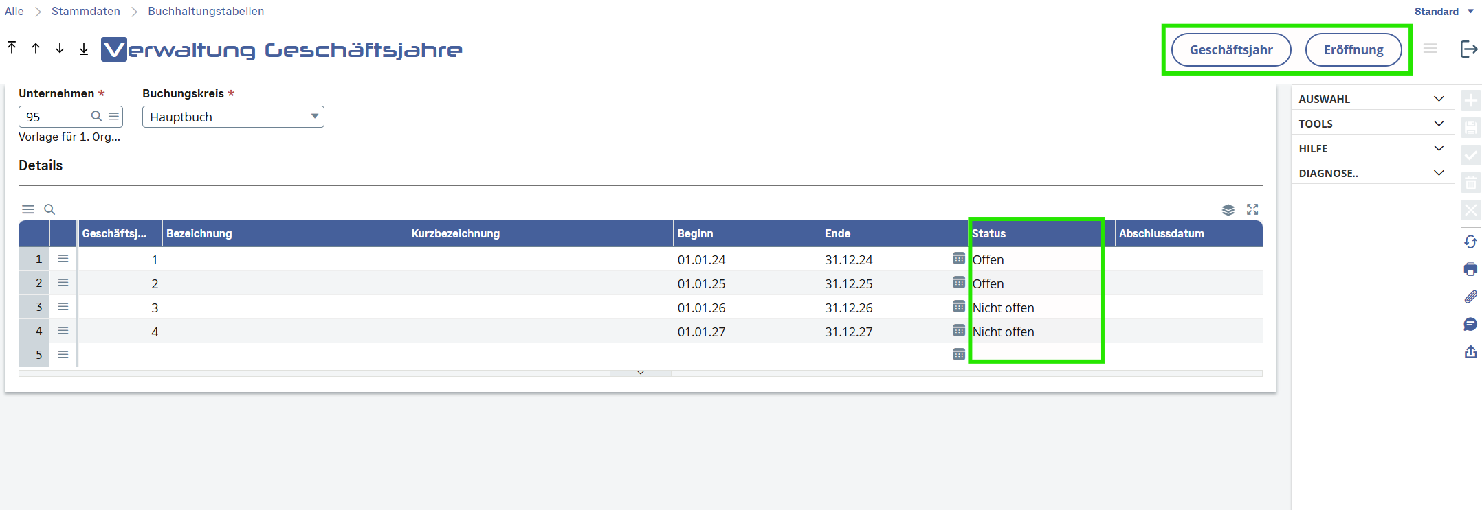 - Über "Eröffnung" können Sie den Status für das jeweilige Geschäftsjahr auf "Offen" setzen.