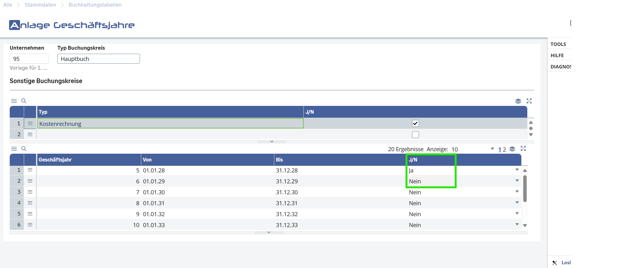 Durch das Abändern von "Nein" auf "Ja", werden die Geschäftsjahre angelegt.