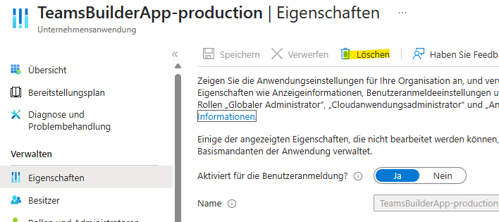 - Wechseln Sie in der Unternehmensanwendung auf "Eigenschaftten" und klicken auf "Löschen".