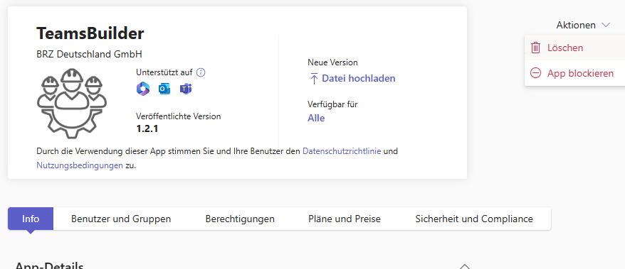 - Suchen Sie nach der App "Teamsbuilder", öffnen diese und klicken auf "Aktionen" -> "Löschen"
