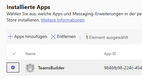 - Wechseln Sie im Teams Admin-Center in den Bereich: App-Setuprichtlinien - Microsoft Teams Admin Center und öffnen die Richtlinie Global. Entfernen Sie dort die TeamsBuilder App, damit diese in der Teams-Anwendung entfernt wird.