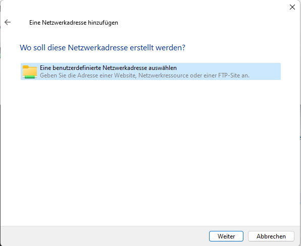 - Klicken Sie Weiter → Eine benutzerdefinierte Netzwerkadresse → Weiter.