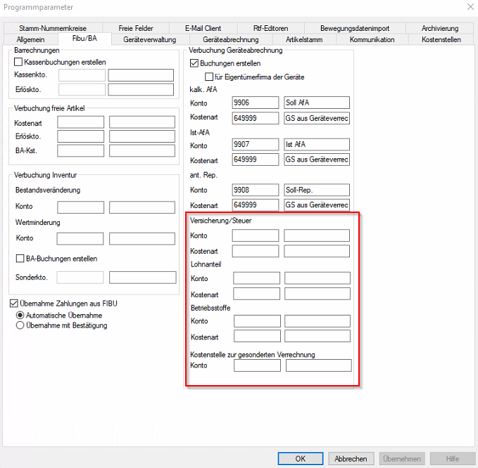 BRZ 7 ► Geräte-/Lagerverwaltung ► Extras ► Programmparameter ► Fibu/BA