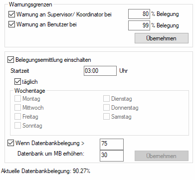 - Standardmäßig sind Warnungsgrenzen für Datenbankgröße und Tabellenbelegung hinterlegt.