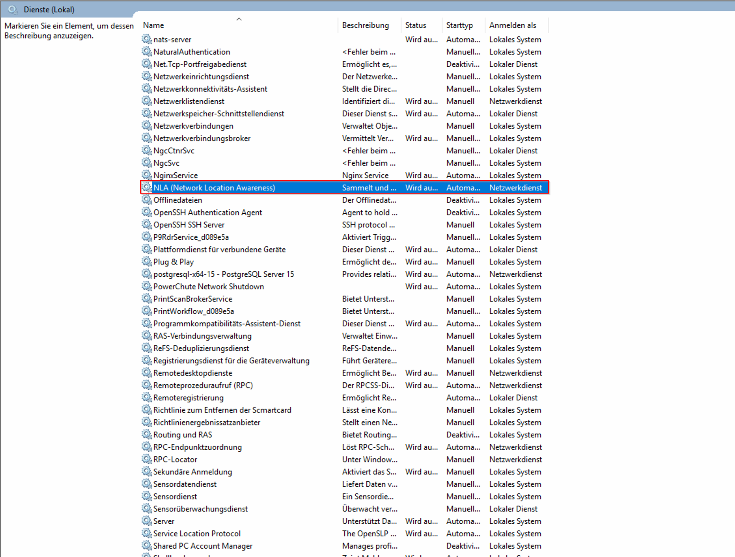 (Screenshot: Dienste-Fenster mit markiertem NLA-Dienst)