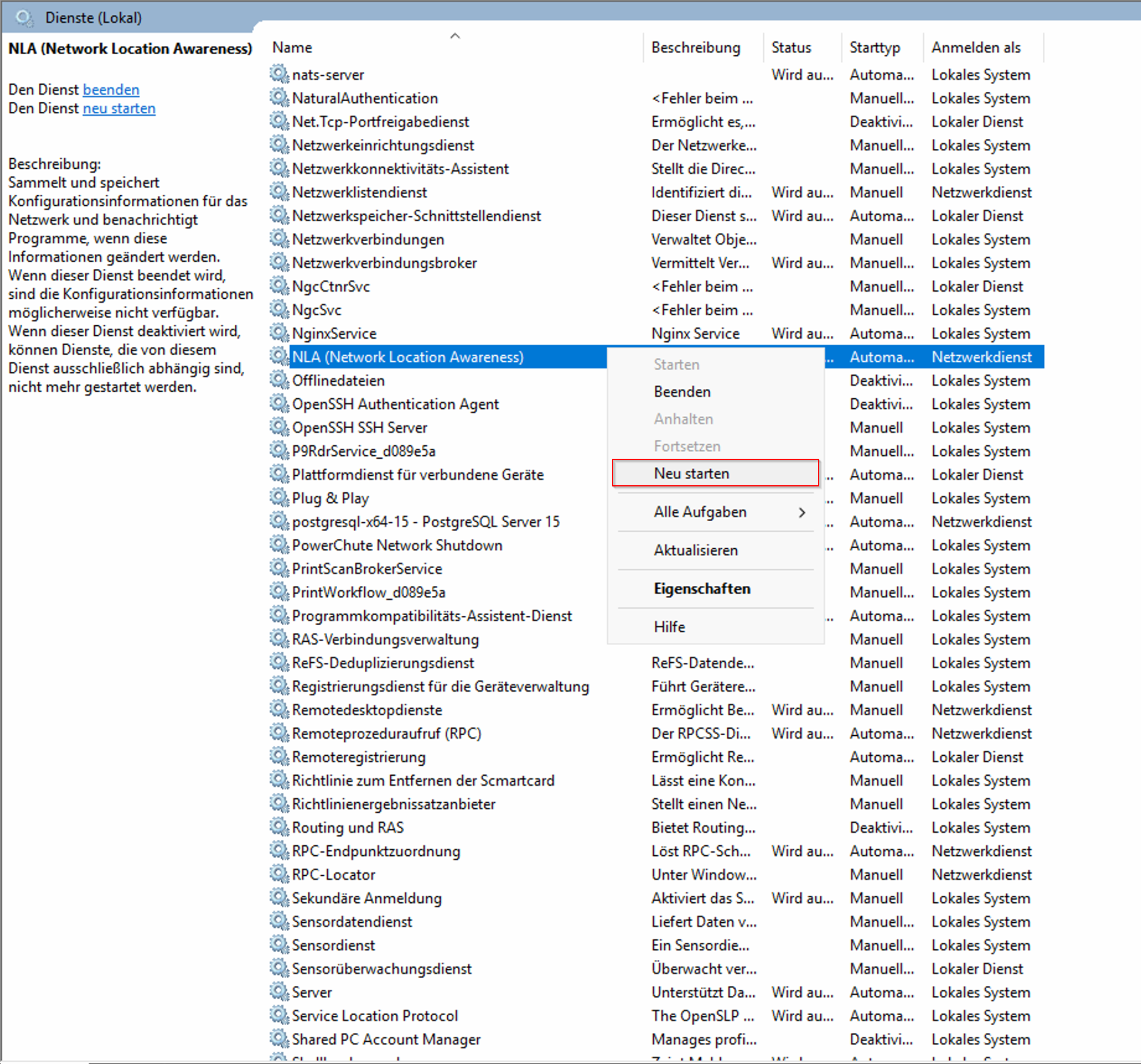 Der Network Location Awareness (NLA)-Dienst sorgt dafür, dass Windows die Netzwerkkonfiguration erkennt und anwendet. Wenn dieser Dienst nicht korrekt läuft, können Netzwerkprobleme auftreten (z. B. keine Verbindung oder falsches Profil).
