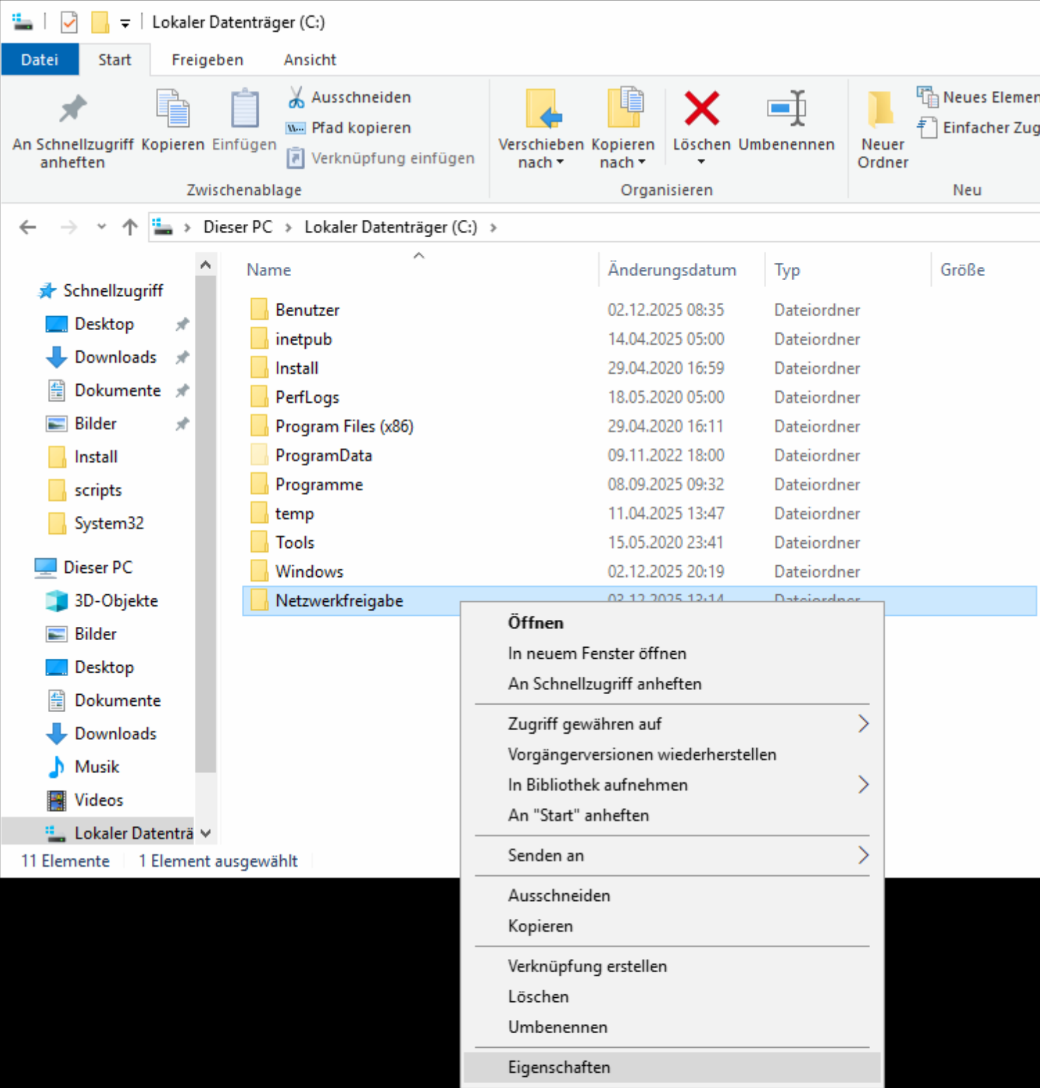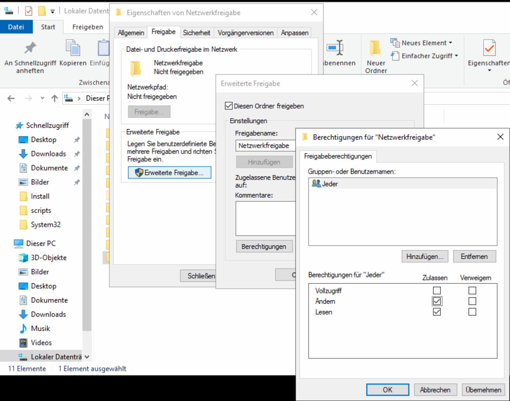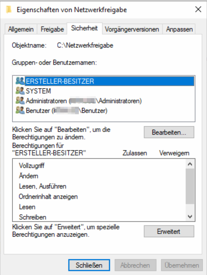 - Die Freigabe-Berechtigungen sind nur eine „grobe“ Zugriffsebene. Die eigentliche Sicherheit wird über NTFS-Berechtigungen gesteuert.